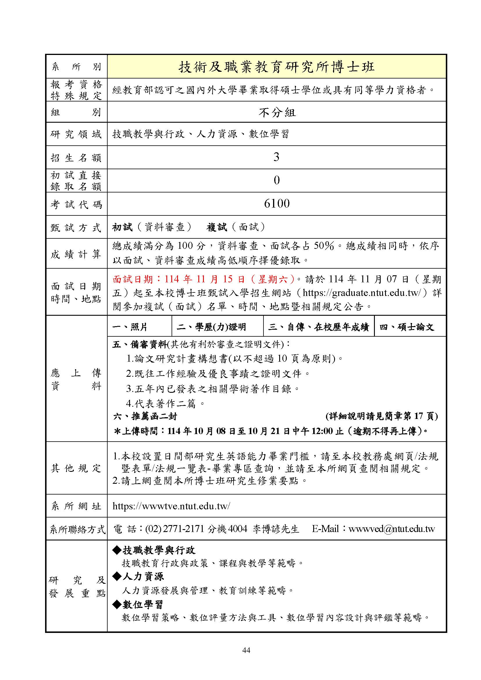 115學年度技術及職業教育研究所 博士班甄試入學招生簡章